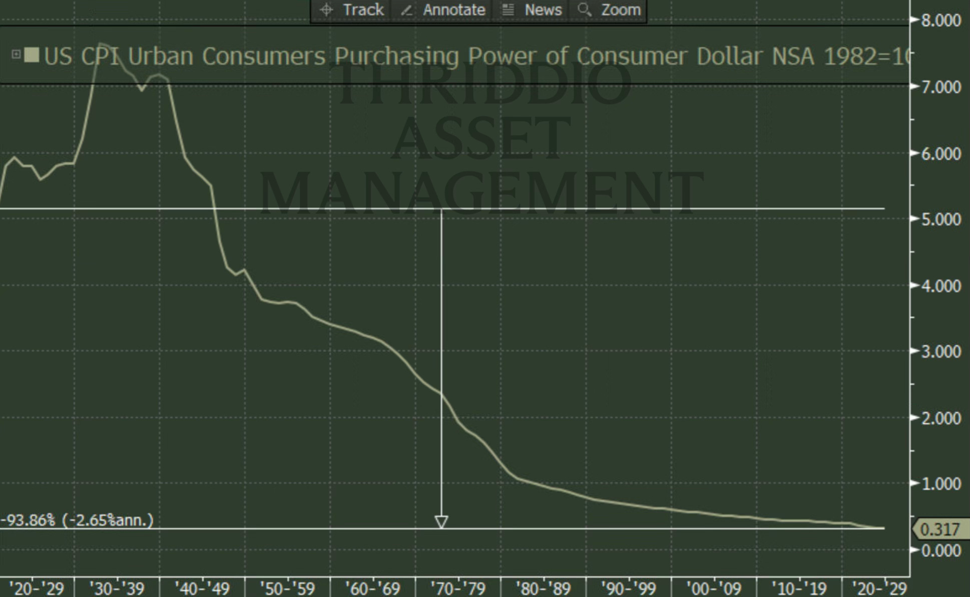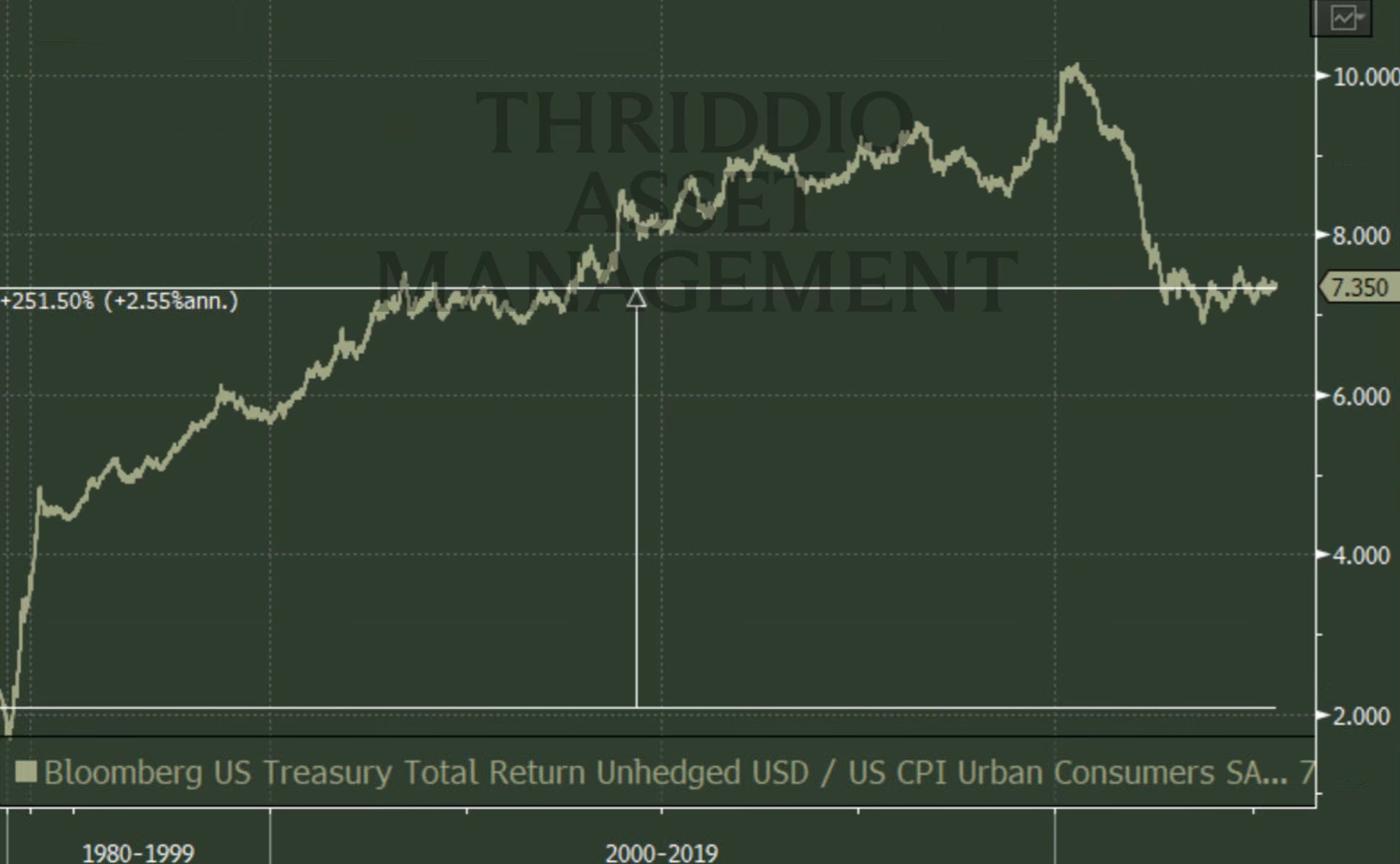 But how can it not? We are many more people alive now than back then. Production output is 1000s of times what it was back then. Have a stroll down any city centre and think about the volumes and amounts of goods and services exchanged today and imagine that same place a mere 50 years ago. The unit of account MUST expand. Repaying debt would be significantly more challenging if it were issued in hard money, repaying it in real rates is difficult enough depsite CPI being often generously marked down. Now interestingly enough, the long term real total return of US treasuries, is, drumroll… *2.5%*.